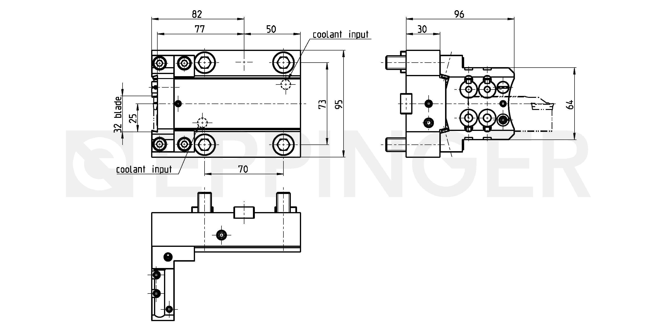 Cut-off tool holder, direction of rotation universal external and central coolant supply Tool height H=32