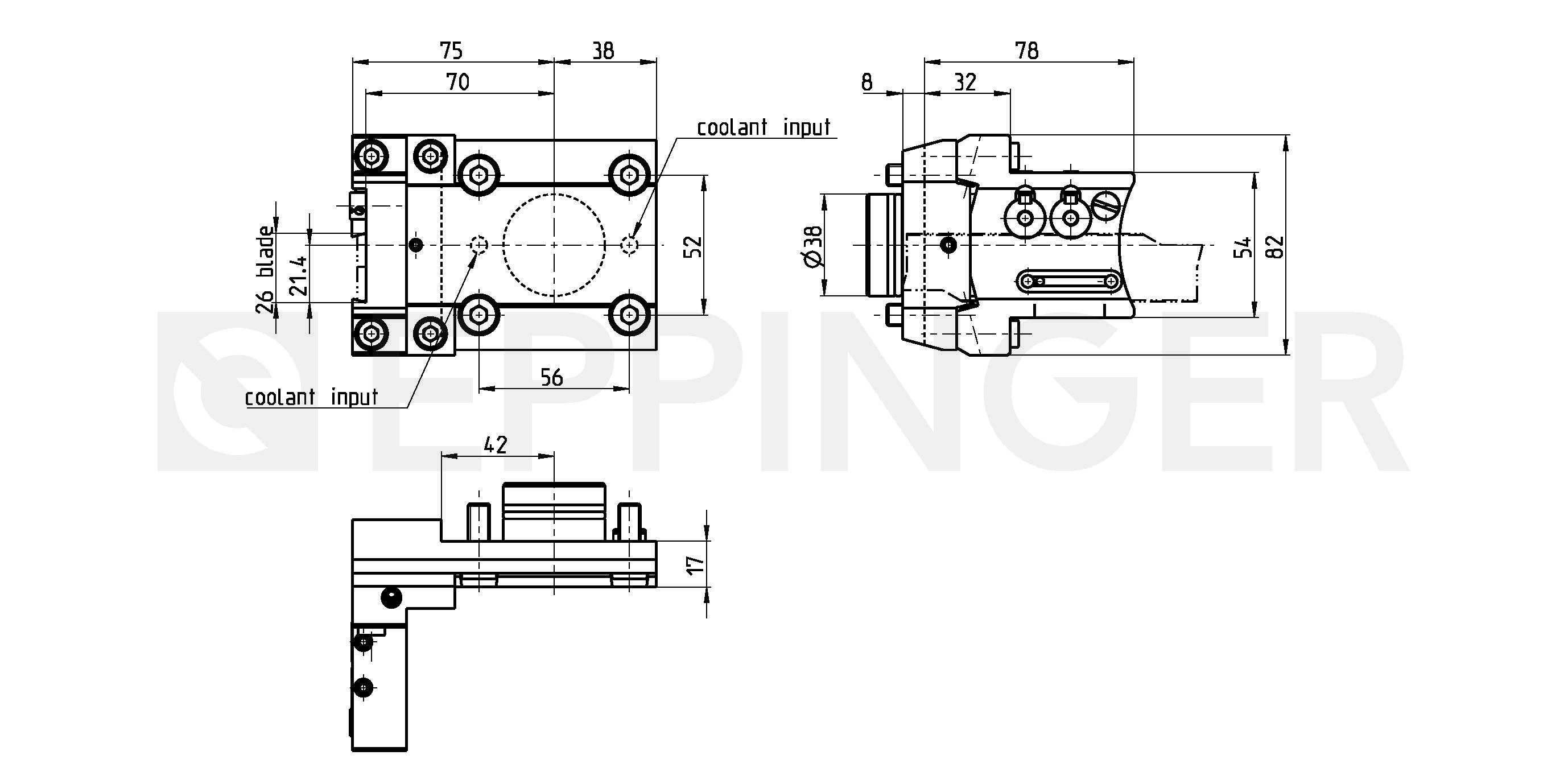 Cut-off tool holder, direction of rotation M4 external and central coolant supply Tool height H=26