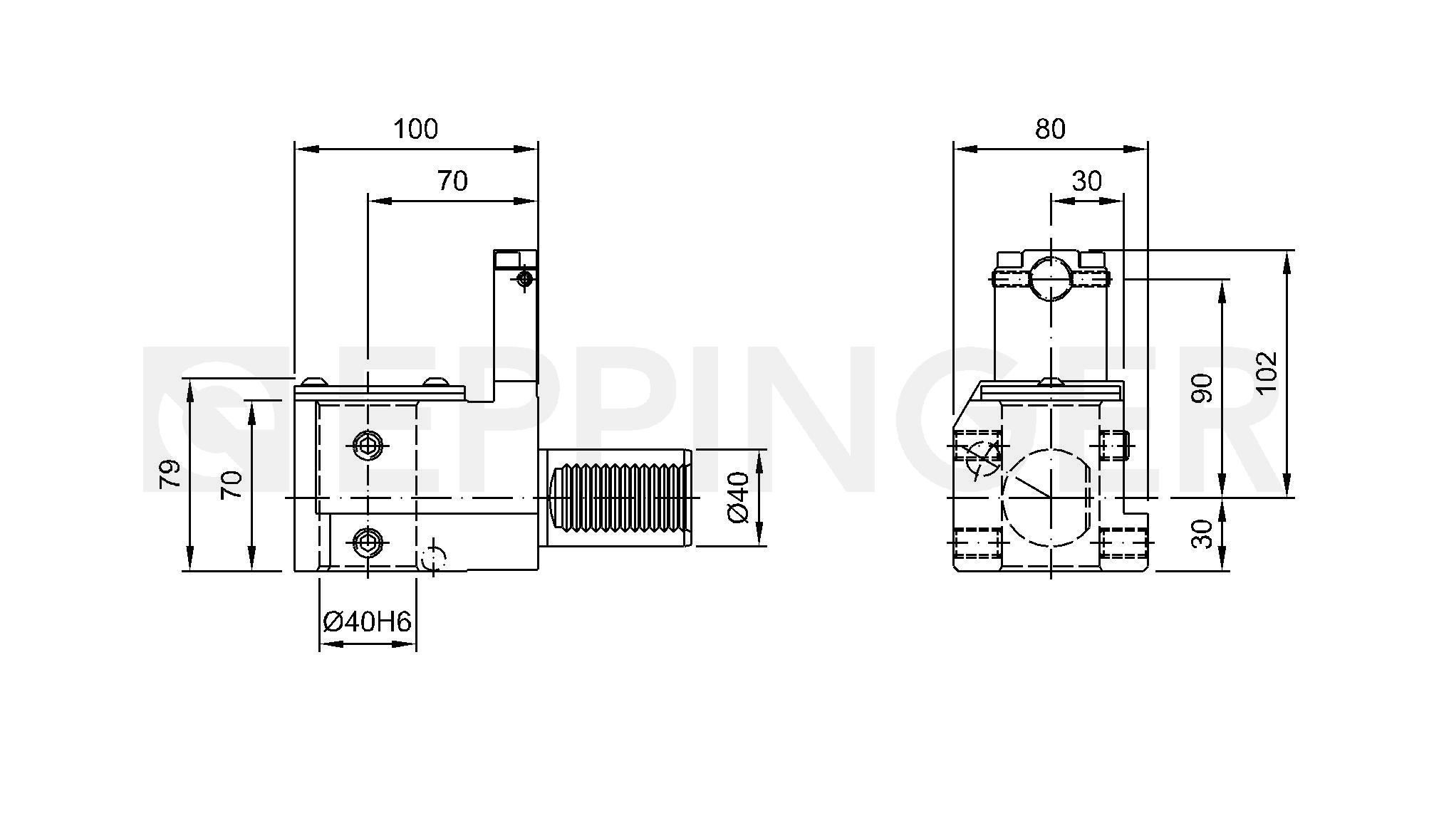 Boring bar holder, angular, right hand cylindrical chuck Ø40, external and central coolant supply