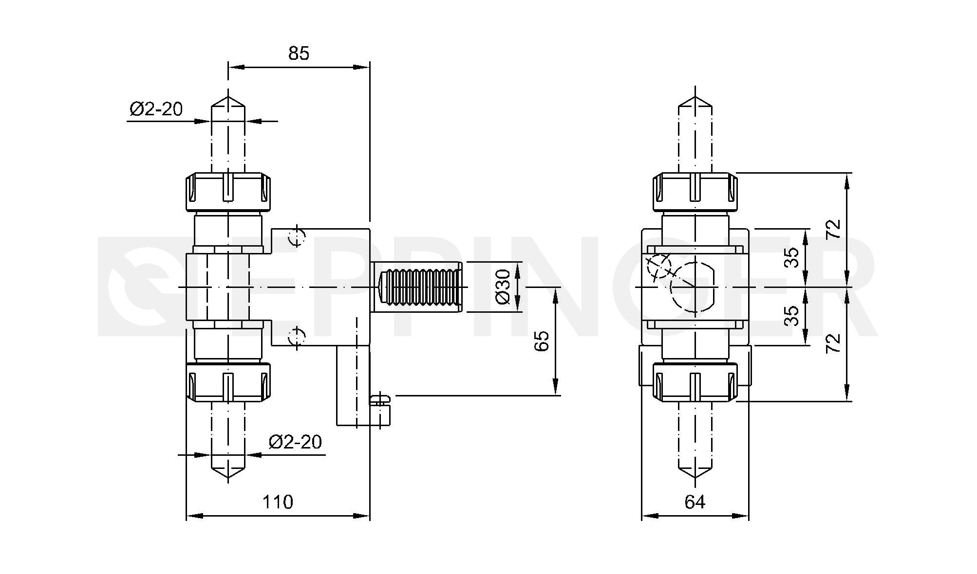 Drill holder, angular, double sided collet chuck, ER32, external and central coolant supply