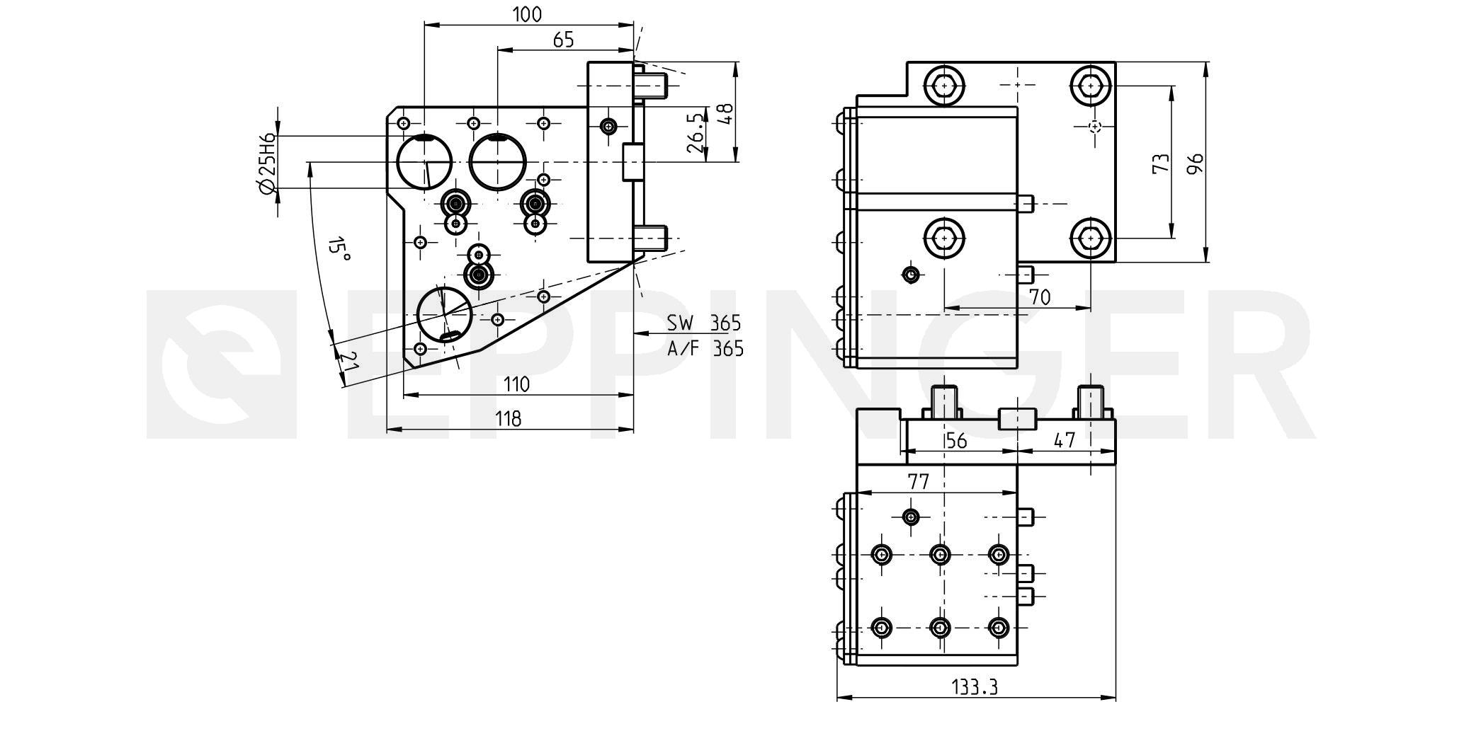Boring bar holder, angular, left hand offset, multiple with additional fixture at 15° cylindrical chuck Ø25, external and central coolant supply