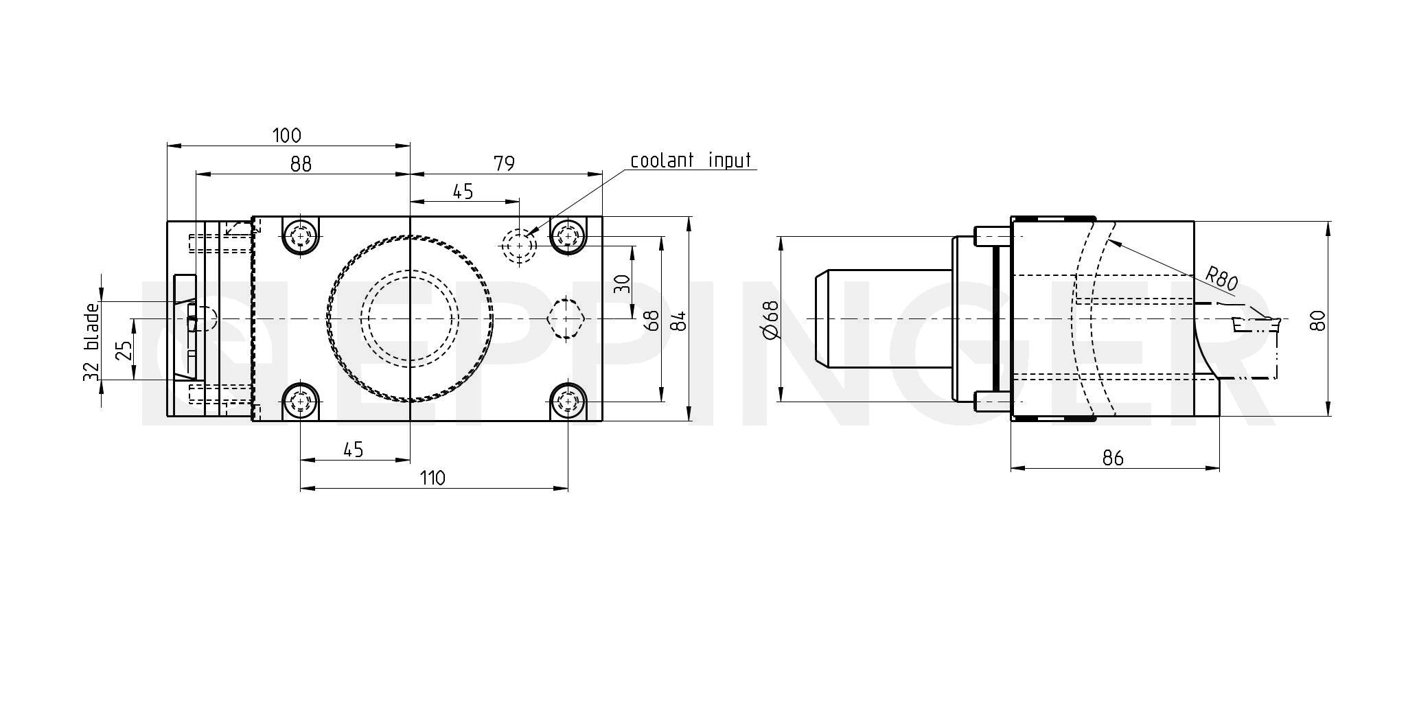 Cut-off tool holder, direction of rotation M4 external and central coolant supply Tool height H=32